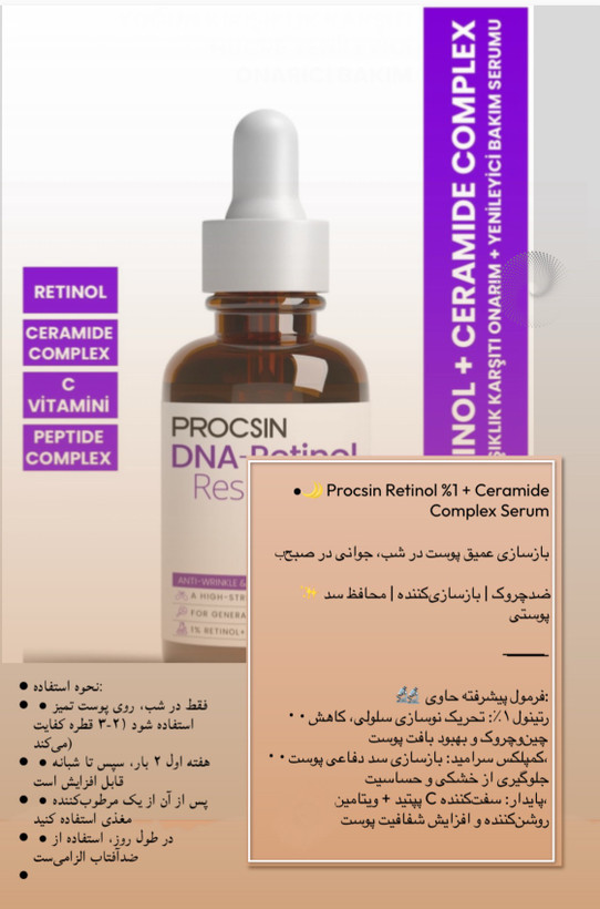 سرم پروکسین حاوی ۱٪ رتینول محصولی ضد پیری و جوانکننده است که با افزایش نوسازی سلولی و تولید کلاژن باعث کاهش چینوچروک، بهبود بافت پوست، افزایش شفافیت و تقویت رطوبت پوست میشود. سرامیدها به بهبود سد پوست کمک میکنند تا خشک نشود.